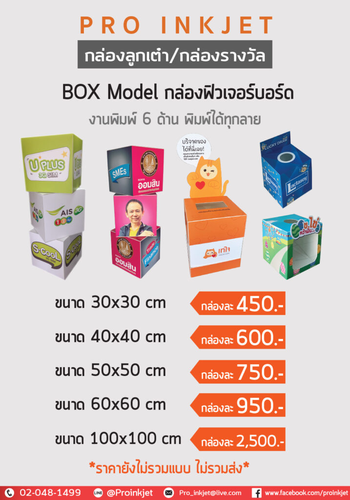 กล่องฟิวเจอร์บอร์ด กล่องลูกเต๋า กล่องรางวัล กล่องถ่ายรูป Mockupกล่องฟิวเจอร์บอร์ด 4 มิล มั่นใจในความแข็งแรง ทนทานน้ำหนักเบา งานพิมพ์รอบด้าน เหมาะสำหรับทำกล่องรางวัล , กล่องลูกเต๋า กล่องเจาะเข้าไปถ่ายรูป , Mockup , กล่องสแตนดี้ การพิมพ์ : ความละเอียด 1440 dpi กันน้ำ วัสดุ : สติกเกอร์ติดฟิวเจอร์บอร์ดสีขาว (เคลือบด้าน)รูปแบบ : งานพิมพ์รอบด้าน กรีดพับ เป็นกล่อง ระยะเวลาผลิต : 1-2 วันทำการ ไม่รวมจัดส่งจำนวน : หากจำนวนเยอะ ราคาถูกลงหมายเหตุ : ราคาไม่รวมทำแบบ ไม่รวมจัดส่ง ไม่รวม vat 7% ขอใบเสนอาคา ขอใบเสนอราคาชื่อผู้ติดต่อเบอร์โทรศัพท์อเมล์ไลน์ไอดีข้อมูลบริษัทสำหรับออกใบกำกับภาษี หรือ ที่อยู่จัดส่งขนาดความกว้าง (px)ขนาดความสูง (px)จำนวนชิ้นลักษณะชิ้นงาน ชิ้นสี่เหลี่ยม ชิ้นสี่เหลี่ยมมุมมน ไดคัทรูปคน ไดคัทรูปแบบอื่นๆขาตั้ง ขาตั้งปีกผีเสื้อ ขาตั้งเหล็ก Value Stand ขาตั้งเหล็ก Dura Standวันที่ต้องการงานหมายเหตุตกลง ผลิตขนาดอื่นๆ หรือจำนวนเยอะราคาถูกลง ทักไลน์ @proinkjet ได้คำตอบ Line Facebook Envelope Phone เรทราคา ผลงาน ผลิตขนาดอื่นๆ หรือจำนวนเยอะราคาถูกลง ทักไลน์ @proinkjet ได้คำตอบ Line Facebook Envelope Phone เราคือโรงงานผลิตแสตนดี้ “เราคือโรงงานผลิตแสตนดี้ สื่อโฆษณา ป้ายฟิวเจอร์บอร์ด ทั้ง ออนไลน์ และ อ็อฟไลน์ ” ใจกลางเมือง!! ด้วยประสบการณ์กว่า10ปี ผลิตงานวันละ 100 ตารางเมตรขึ้น ได้รับความไว้วางใจจากบริษัทชั้นนำมากมาย งานด่วน งานเร็ว ยิ่งสั่งเยอะ ยิ่งราคาถูก ดูตัวอย่างสินค้า และ โปรโมชั่นเพิ่มเติม Facebook ติดตามเฟสบุค Pro Inkjet