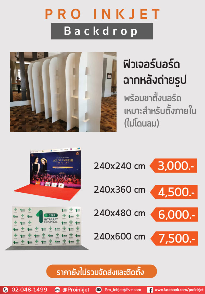 Backdrop แบล็คดรอป ฉากถ่ายรูปฟิวเจอร์บอร์ด Backdrop งานพิมพ์วัสดุฟิวเจอร์บอร์ด 4 มิล เคลือบด้าน ขนาดแผ่นเต็ม 1.2×2.4 m ต่อกัน มีสติกเกอร์ติดรอยต่อให้ สามารถดีไซด์แบบได้ทุกสี ทุกลายกราฟฟิค การพิมพ์ : ความละเอียด 1440 dpi กันน้ำวัสดุ : สติกเกอร์ติดแผ่นฟิวเจอร์บอร์ดสีขาว (เคลือบด้าน)รูปแบบ : แบบโครงเหล็ก เหมาะสำหรับตั้งภายนอก แบบขาตั้งบอร์ด เหมาะสำหรับตั้งภายใน แบบกล่อง เหมาะสำหรับตั้งภายในระยะเวลาผลิต : 1-2 วันทำการ ไม่รวมจัดส่งจำนวน : หากจำนวนเยอะ ราคาถูกลงหมายเหตุ : ราคาไม่รวมทำแบบ ไม่รวมจัดส่ง ไม่รวม vat 7% ขอใบเสนอาคา ขอใบเสนอราคาชื่อผู้ติดต่อเบอร์โทรศัพท์อเมล์ไลน์ไอดีข้อมูลบริษัทสำหรับออกใบกำกับภาษี หรือ ที่อยู่จัดส่งขนาดความกว้าง (px)ขนาดความสูง (px)จำนวนชิ้นลักษณะชิ้นงาน ชิ้นสี่เหลี่ยม ชิ้นสี่เหลี่ยมมุมมน ไดคัทรูปคน ไดคัทรูปแบบอื่นๆขาตั้ง ขาตั้งปีกผีเสื้อ ขาตั้งเหล็ก Value Stand ขาตั้งเหล็ก Dura Standวันที่ต้องการงานหมายเหตุตกลง ผลิตขนาดอื่นๆ หรือจำนวนเยอะราคาถูกลง ทักไลน์ @proinkjet ได้คำตอบ Line Facebook Envelope Phone เรทราคา ผลงาน ผลิตขนาดอื่นๆ หรือจำนวนเยอะราคาถูกลง ทักไลน์ @proinkjet ได้คำตอบ Line Facebook Envelope Phone เราคือโรงงานผลิตแสตนดี้ “เราคือโรงงานผลิตแสตนดี้ สื่อโฆษณา ป้ายฟิวเจอร์บอร์ด ทั้ง ออนไลน์ และ อ็อฟไลน์ ” ใจกลางเมือง!! ด้วยประสบการณ์กว่า10ปี ผลิตงานวันละ 100 ตารางเมตรขึ้น ได้รับความไว้วางใจจากบริษัทชั้นนำมากมาย งานด่วน งานเร็ว ยิ่งสั่งเยอะ ยิ่งราคาถูก ดูตัวอย่างสินค้า และ โปรโมชั่นเพิ่มเติม Facebook ติดตามเฟสบุค Pro Inkjet
